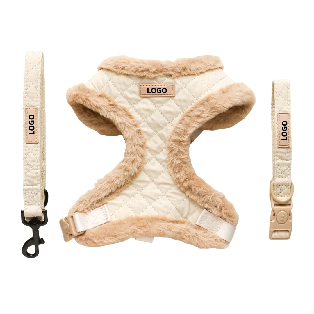 Designer Dog Accessories Plush Fleeced Furred Pet Dog Harness Leash Set Winter Quilted Padded Harness Vest for Cats and Dogs